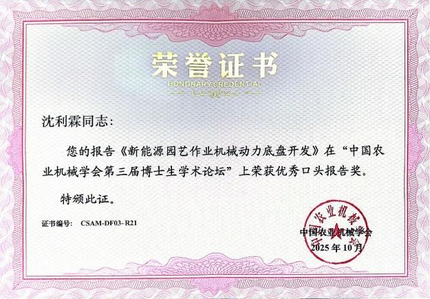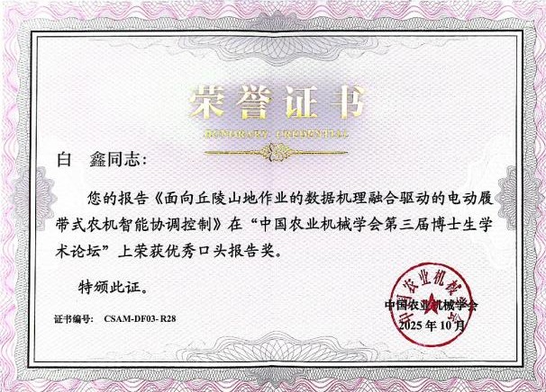 2025年10月18日,中国农业机械学会第三届博士生学术论坛在合肥召开。德赢官网殷国栋教授团队2024级博士研究生沈利霖、白鑫依托国家重点研发计划“工厂化农业关键技术和智能农机装备”重点专项 “新能源园艺作业动力机械创制开发”,分别围绕轮式、履带式新能源农机装备动力底盘设计进行了工作进展汇报,双双荣获得论坛“优秀口头报告”奖。