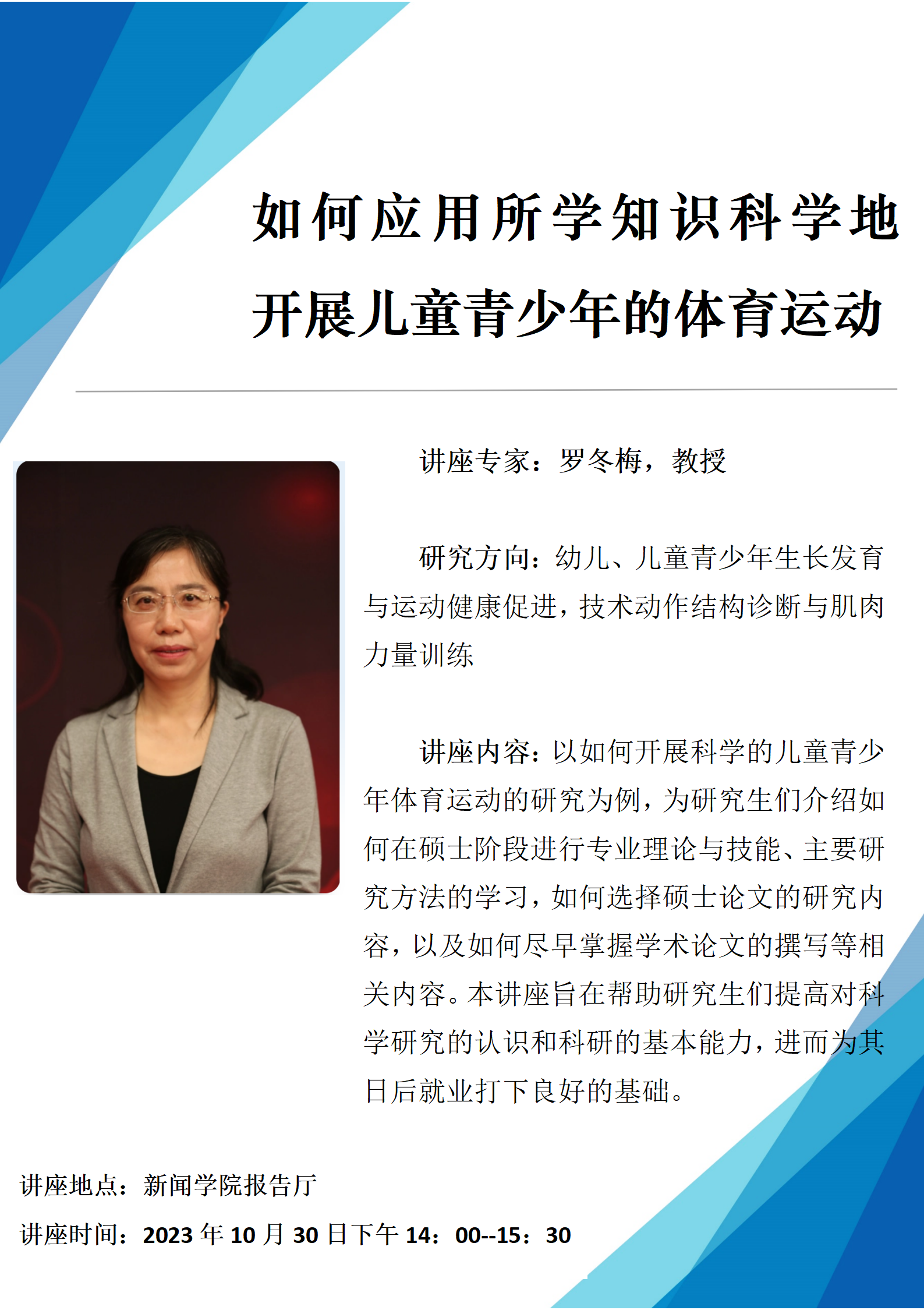 为更好地提升和培养LETOU国际米兰官网学生的科研素养和实践应用能力,营造良好学习氛围,LETOU国际米兰官网于2023年10月30日下午14:00--17:30在新闻学院报告厅,举行了题为《如何应用所学知识科学地开展儿童青少年的体育运动》和《传承中华优秀传统文化弘扬中华体育精神》的两场精彩讲座,我院本科生、研究生悉心聆听。