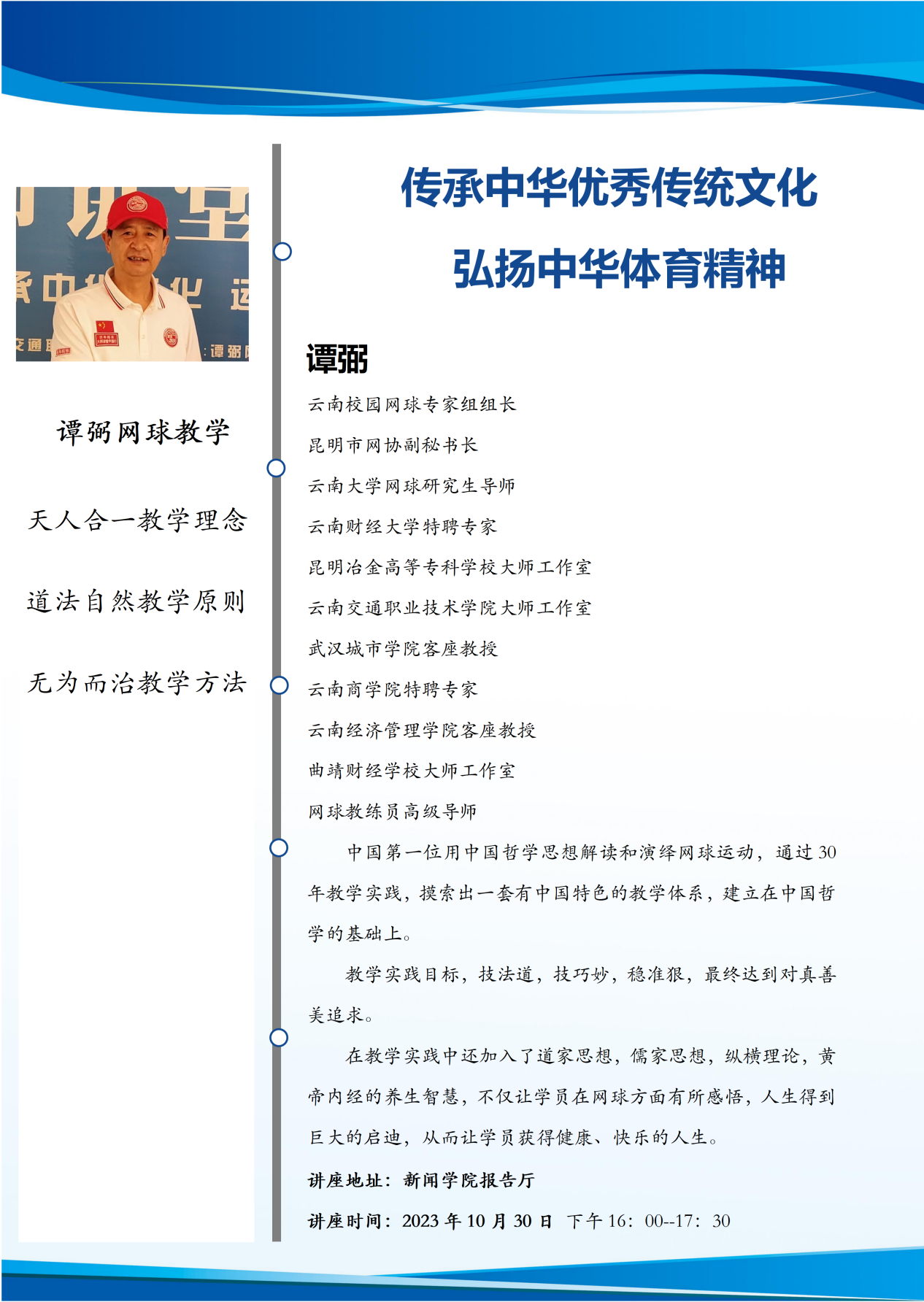 谭弼老师作为长期从事一线网球教学、研究、训练的高教教练员导师,其以爱学生为开场,为广大学生带来了一场以爱为核心,用中国哲学思想解读和演绎网球运动,分享其学习、领悟、深思、运用中华优秀传统文化于网球教学的心得、体会,让广大同学在领悟传统文化魅力的同时,将其应用于运动专项技能学习中进一步找到了指导思想和实践路径,在讲座的问答互动环节,广大同学积极地与谭老师进行互动。
