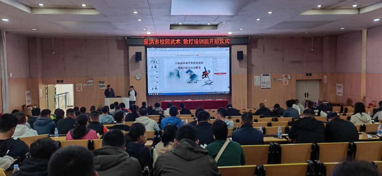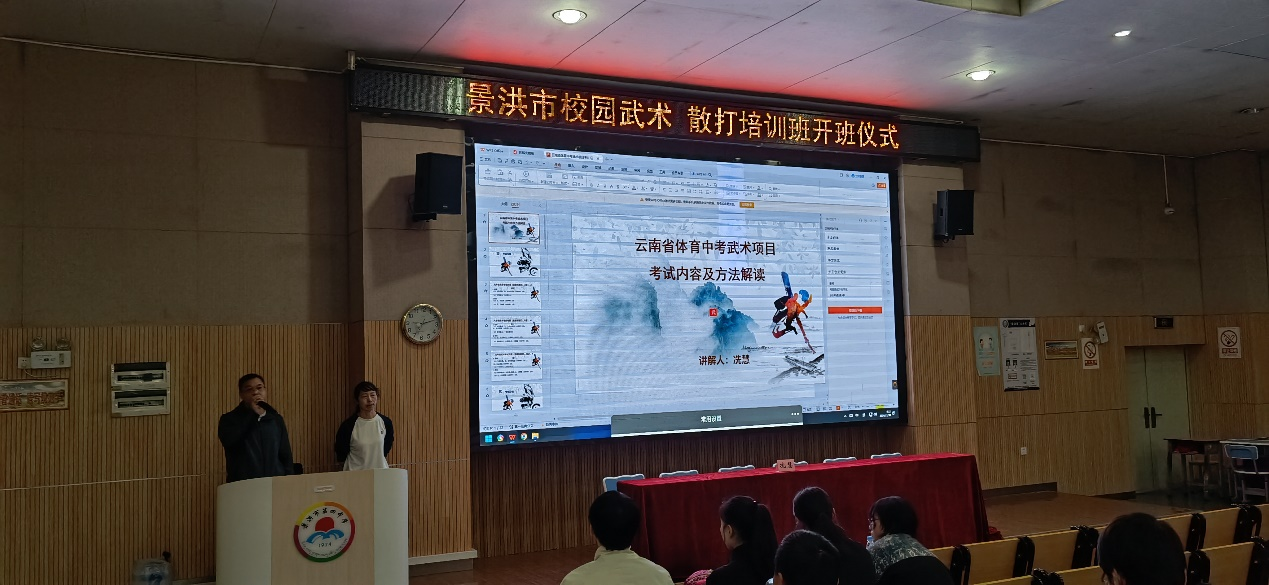 11月30日上午9点,开班仪式成功在景洪市第四中学报告厅举办。本次培训内容分为考试内容解读、评分标准介绍、规定套路学习三个板块,共有来自景洪市35所中小学、幼儿园的108名体育教师参与了此次培训活动。